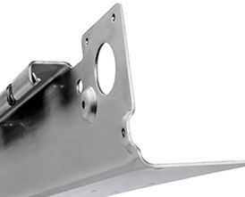 This image shows a curved sheet metal profile. All the bends and the curves have been created on the Bystronic machines using just standard press brake tooling. The curves have been created by using a bending technique called multi-bending or step-bending. The curve is divided into a series of slight bends and flats so that the curve is created as an approximation by flats at a tangent to the desired curve. The closer each bend is together the better the finished curve will look but the longer it will take to bend the sheet metal work. There is normally a compromise between the finished shape and the time spent bending which will affect the costs for the customer. The advantage of this type of bending, called step-bending, over say having a special form tool made is the ability to change the curved profile whenever the customer wants to update a design without any tooling costs, just a few minutes with the control software is all that’s needed.