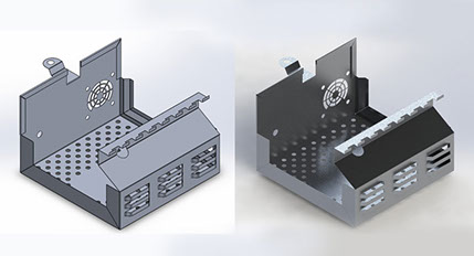 As well as achieving the correct tolerance of sheet metal work from the 3D model the actual simple alignment of parts can be checked. The example show here of a sheet metal box and cover is a classic example. The box and cover may be presented to us as 2 separate 2D drawings on a DXG or DXF file or even a PDF image. By creating a 3D sheet metal model of the 2 parts together with the cover in position on the box we can check out for the customer any problems with the position of holes and the correct clearance for the cover to fit allowing for bend radius and powder coating thickness. If there is a problem at this stage it’s much easier to change the design slightly with the customer than manufacture a box and a lid both to the design drawings but not actually fitting together in assembly.