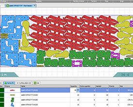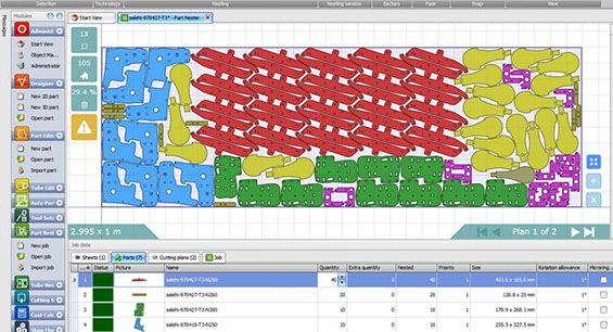 The laser cutting next show here (Right Image) are of thin gauge parts that were not bent and had no grain effect on the sheet so we were free to get as many as possible from a sheet of metal with angular freedom of 5 degrees. You can see that the software is able to use a true shape nester to fit parts inside each other’s profile where possible to get the best use of material.