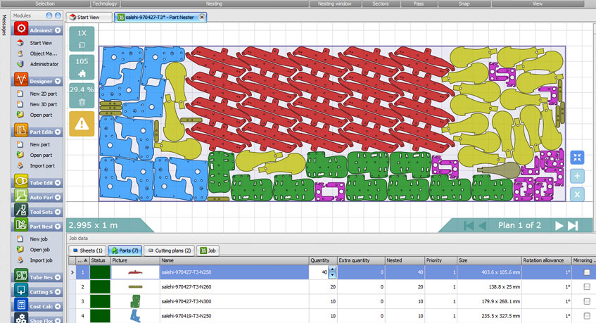 Once the sheet metal blank has been tooled ready to produce a single part it needs to be applied to a sheet of metal ready for actual manufacture. The optimized pattern of components on the sheet can be automatically calculated by the BySoft software to achieve the best material yield from any given sheet size and quickest cutting path across the sheet to save time. The sheet used can be standard sheets which for us would be a choice of 3 sizes either 2.0M x 1.0M, 2.5M x 1.25M or 3.0M x 1.5M. If the volume is high enough then special sizes can be purchased in some materials to suit a component length and reduce wastage. For example, a sheet metal component blank that is 1.6M long would be wasteful with a 2.0M x 1.0M sheet but would be perfect have we purchased a 1.7M x 1.0M sheet. We can also use up remnants from past work or sheets in unusual shape (like circle, rectangle, etc.) to save buying in fresh material.